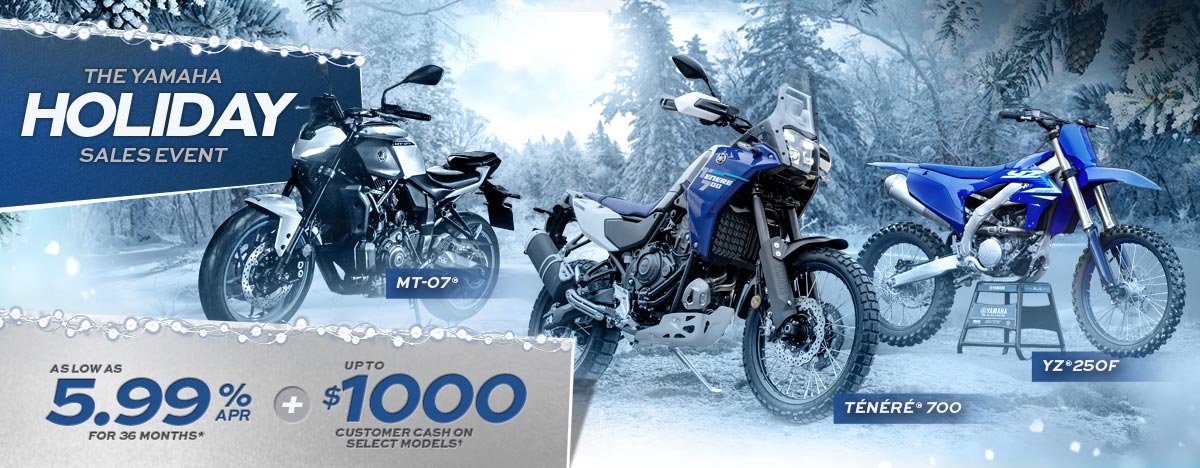 *Offer available on approved purchases of new 2023 – 2026 Yamaha Motorcycles made on the Yamaha Credit Card issued by WebBank. Offer valid 10/1/2025 – 12/31/2025. Account must be