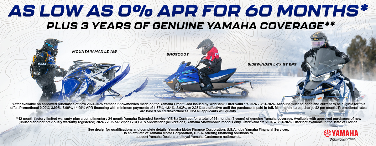 *Offer available on approved purchases of new 2024-2025 Yamaha Snowmobiles made on the Yamaha Credit Card issued by WebBank. Offer valid 1/1/2026 - 3/31/2026. Account must be open and current to be eligible for this offer. Promotional 0.00%, 3.99%, 7.99%, 14.99% APR financing with minimum payments of 1.67%, 1.84%, 2.03%, or 2.38% are effective until the purchase is paid in full. Minimum interest charge $2 per month. Promotional rates are based on creditworthiness. Not all applicants will qualify.